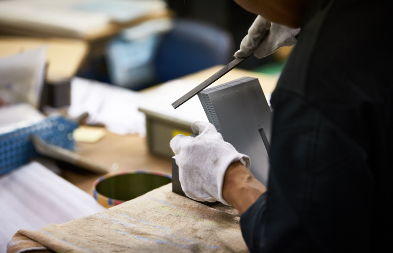 社内設備において、塗装・シルク印刷・サンドブラスト・ヘアーライン等の表面処理も全て社内で行える為、様々なお客様のニーズに対応させて頂いています。更に、めっき設備も完備することにより、ニッケルめっき後のシルク印刷やヘアーライン後アルマイト、塗装等、一般的には数社が関わるような処理も、一貫生産にて対応致します。