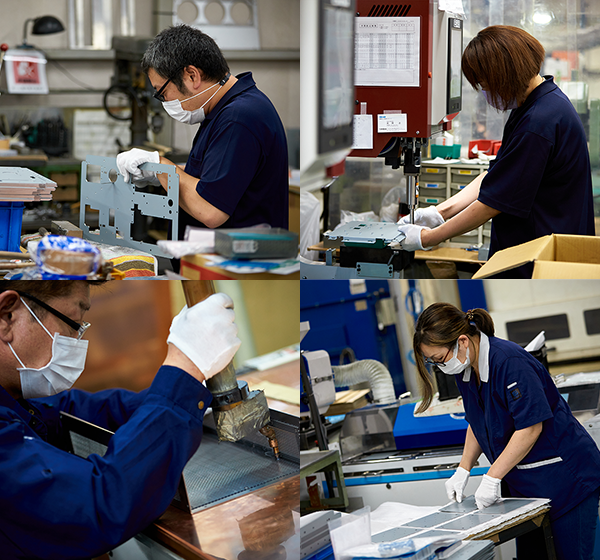 精密板金加工・塗装・シルク印刷・めっき各種まで社内製作し品質安定を実現。全ての工程を生産管理システムで一元管理し、安定供給に努めています。